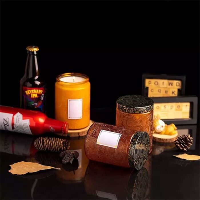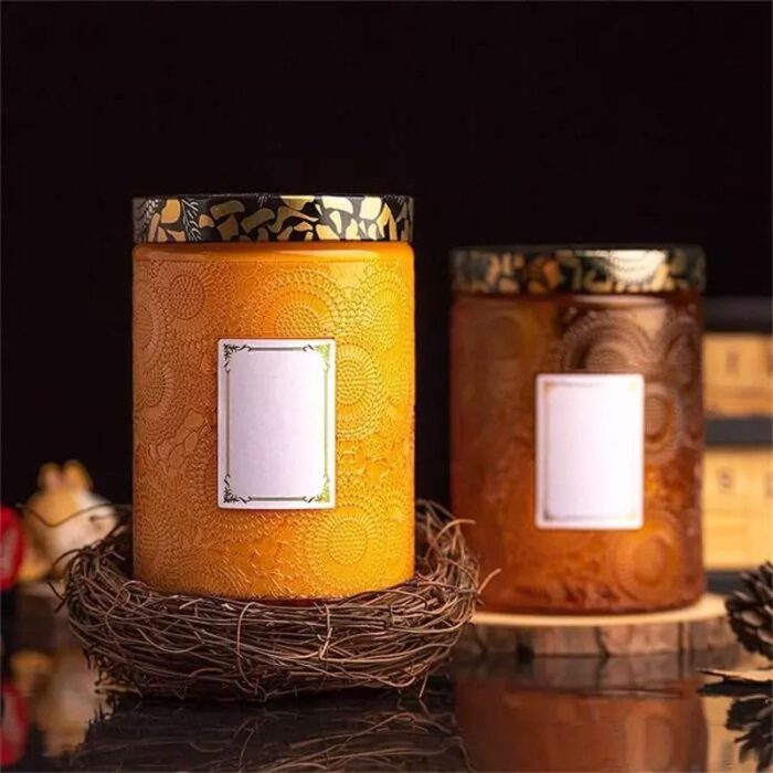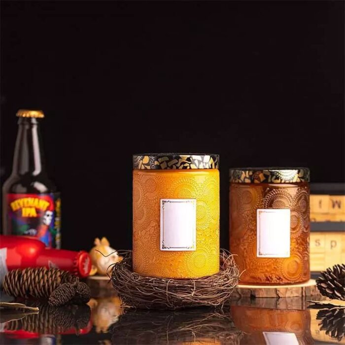 Γυάλινο Ανάγλυφο Βάζο Μεγάλο Καραμελέ. Καινούργια πολυτελή ανάγλυφα δοχεία για την κατασκευή αρωματικών κεριών, σε υπέροχα, γιορτινά χρώματα! Με ενσωματωμένο πλαίσιο για ετικέτα για ολοκληρωμένο κερί προϊόν.